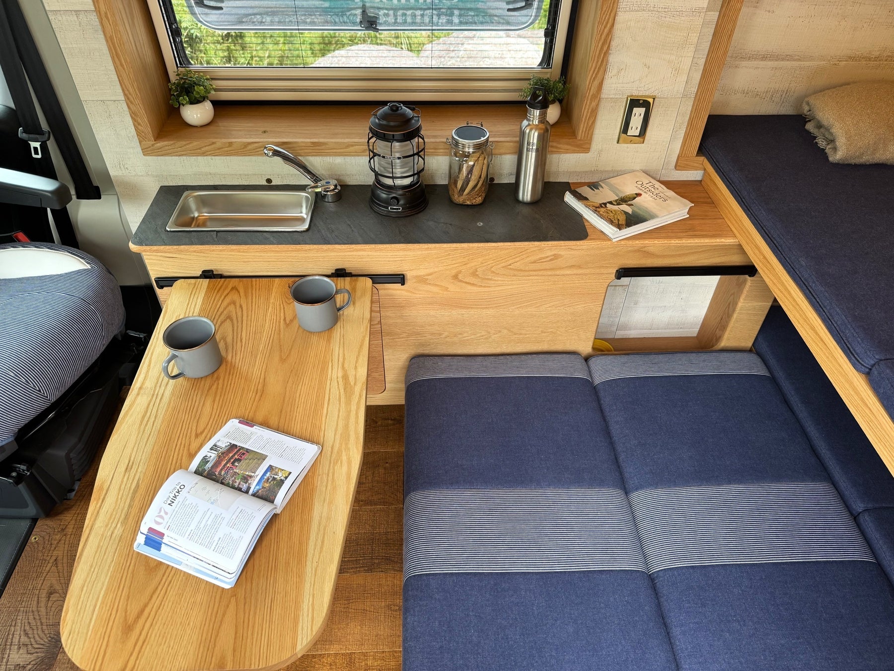 ちょっとした洗い物や手洗い等に活躍するステンレス製のミニシンク(給排水タンク各12L)を搭載。車高の高いフィアットデュカトがベースなので、キッチンカウンターの前に立って作業することも可能です。(室内高1,850mm)