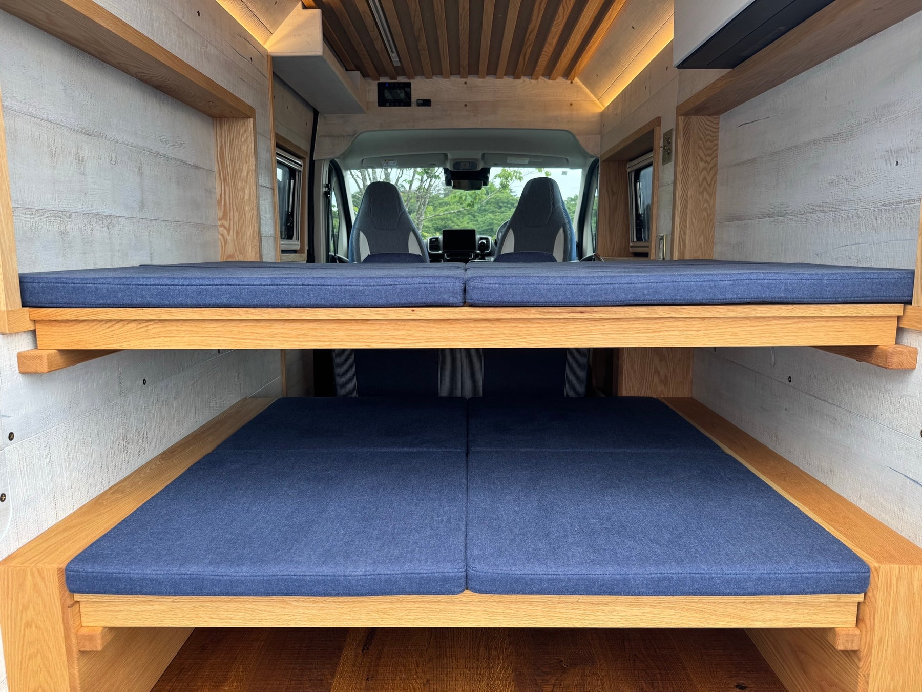 リヤ常設ベッドのサイズは、L1,305mm×W1,820mm。車両に対して横向きで大人2名就寝が可能な広いベッドスペースです。
