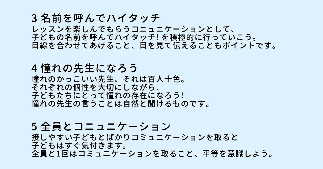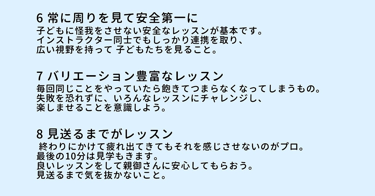 このルールを大切にすることで、インストラクターとしての自覚と責任をもってレッスンを行うことができ、結果としてより質の高いレッスンを生徒さんに提供できると考えています!