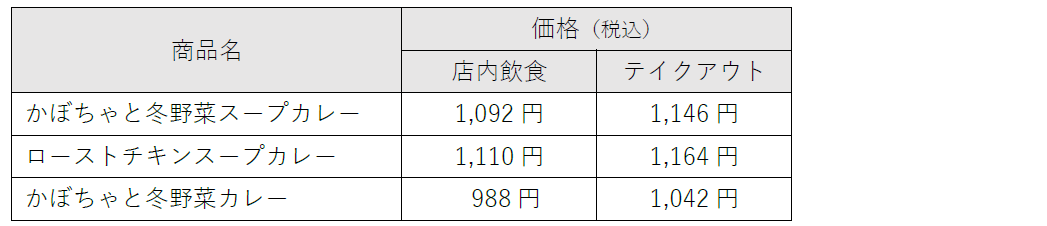 ※表示価格は「かぼちゃと冬野菜スープカレー」「ローストチキンスープカレー」はライス200g、辛さ普通の場合、「かぼちゃと冬野菜カレー」はライス300g、辛さ普通の場合の税込価格です。