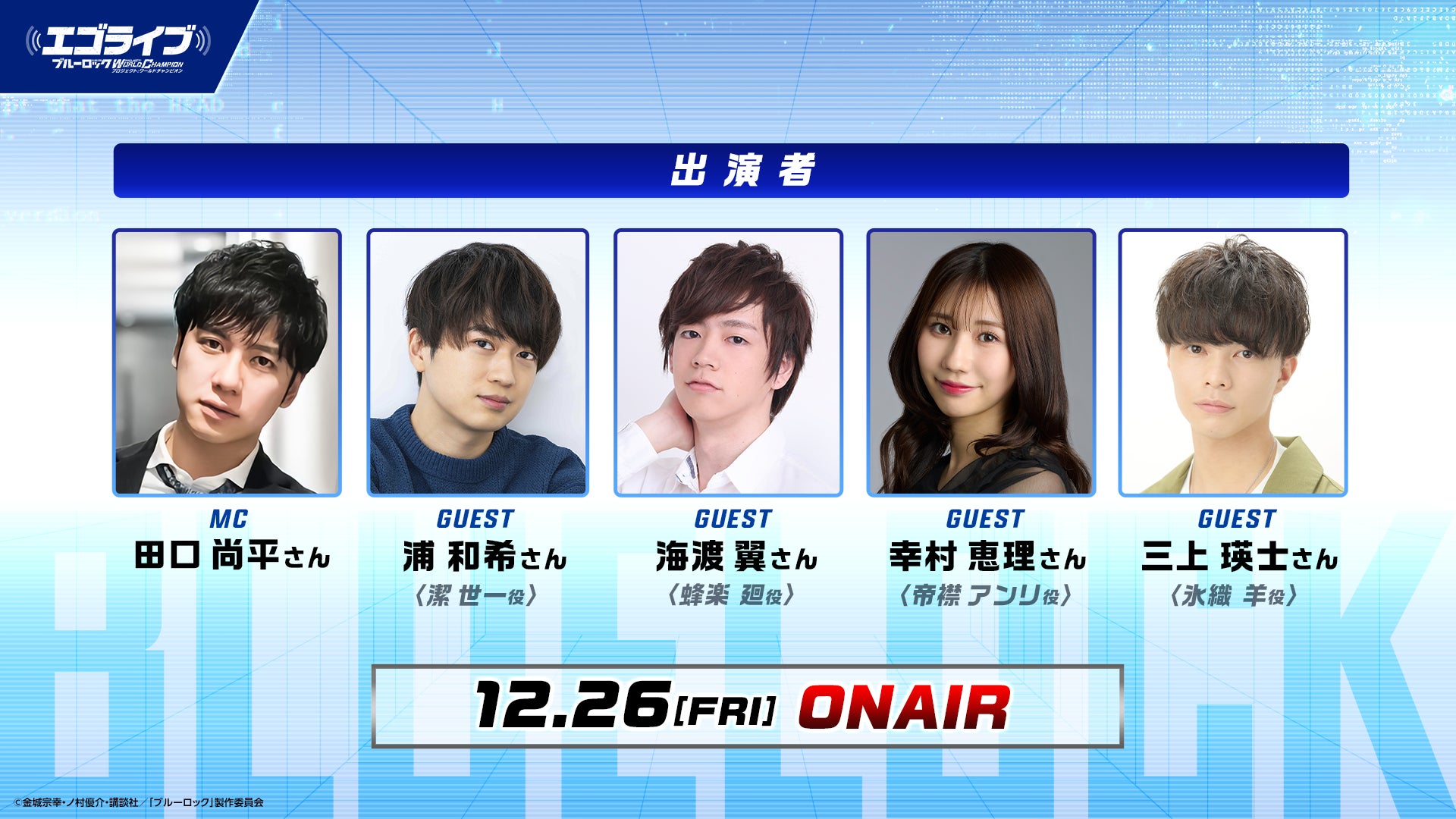 出演は浦 和希(潔 世一 役)、海渡 翼(蜂楽 廻 役)、幸村 恵理 (帝襟アンリ 役)、三上 瑛士(氷織 羊 役)の豪華メンバーでお届けしています。