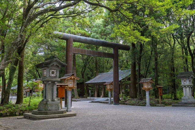 初代天皇である神武天皇とその父母を祀った神社です。神武天皇が東征に出る前に政治【まつりごと】を行っていた場所とされ、代々土地の信仰を集めてきました。現在でも地元では「神武さま」と呼ばれ親しまれています。参道に並ぶ灯篭や、国の天然記念物に指定されている樹齢400年の大木など、境内は神秘的な雰囲気に包まれています。家内安全や夫婦和合、安産・子宝のご利益、また神武天皇が東征されたことにちなんで、必勝祈願や合格祈願に訪れる参拝者も後を絶ちません。