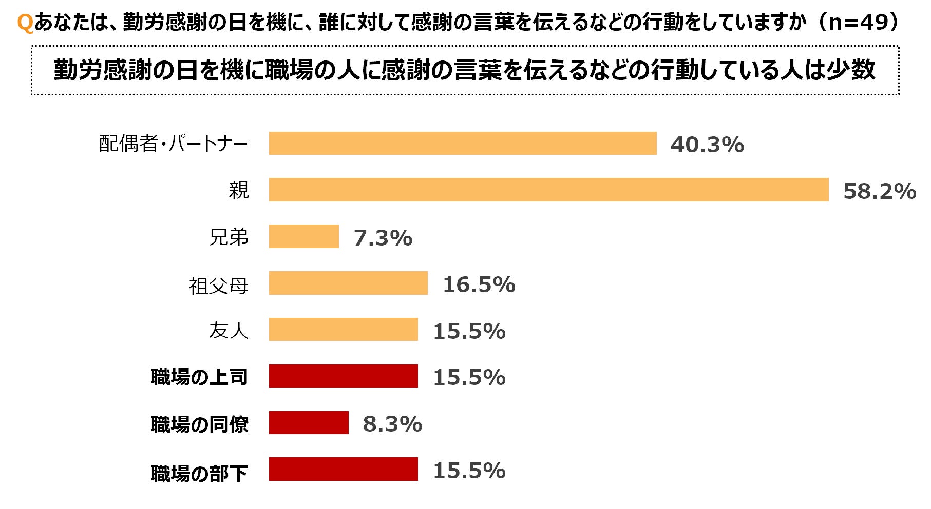 また、勤労感謝の日を機に、感謝の言葉を伝えるなどの行動している相手は「パートナー・配偶者(58.2%)」「親(40.3%)」が多く、職場の人は「上司(15.5%)」「同僚(8.3%)」「部下(15.5%)」という結果になりました。