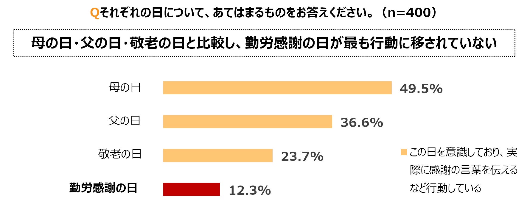 1.母の日・父の日・敬老の日と比較し、勤労感謝の日が最も行動に移されていない。