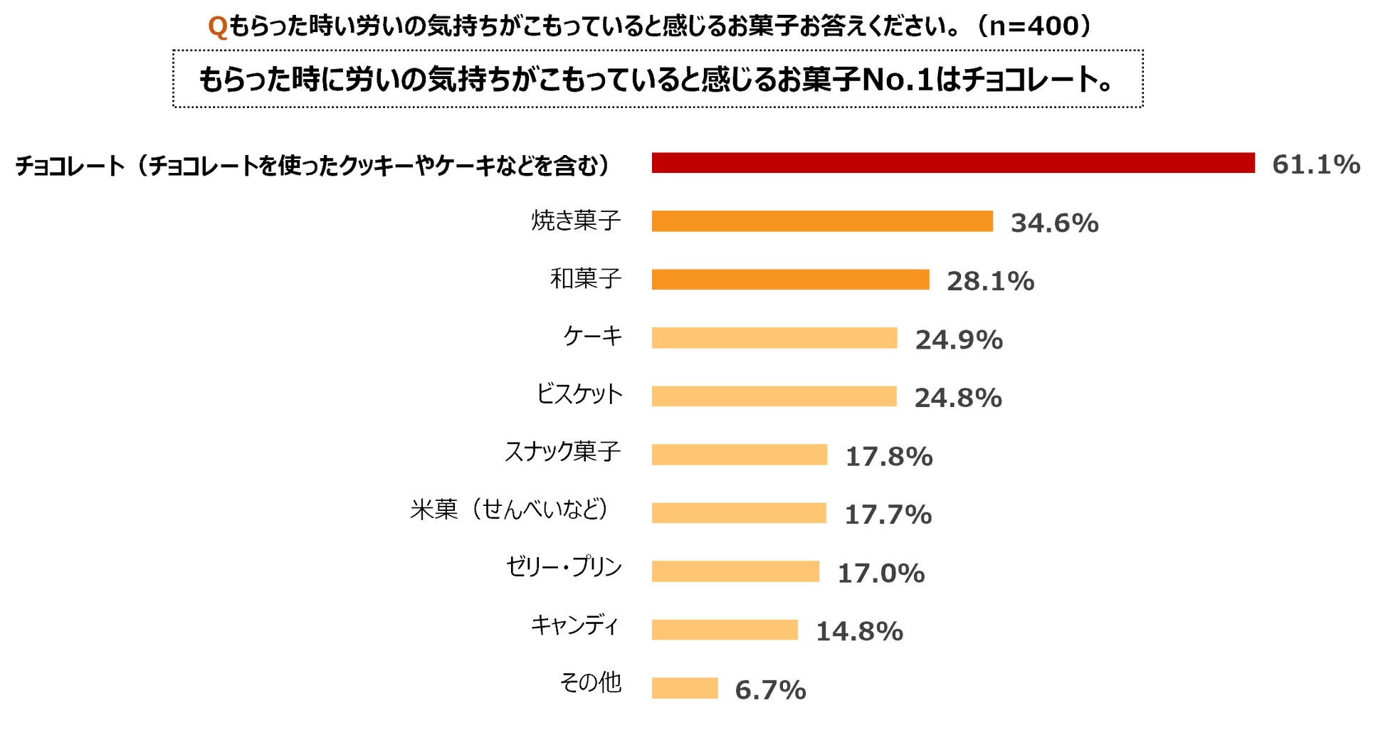 また、もらった時に労いの気持ちがこもっていると感じるお菓子の種類を聞いたところ、チョコレート(61.1%)が最多となりました。続いて「焼き菓子(34.6%)」「和菓子(28.1%)」という結果になりました。