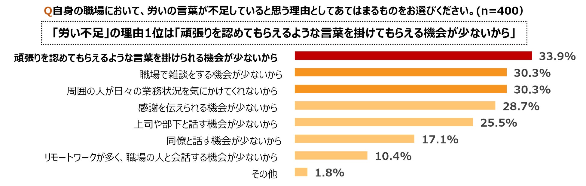 また、自身の職場において、日常的に労いの言葉が不足していると思うか聞いたところ、2人に1人(50.5%)が「とても思う(16.2%)」、「やや思う(34.3%)」と回答しました。「労い不足」の理由TOP3は、「頑張りを認めてもらえるような言葉を掛けられる機会が少ないから(33.9%)」、「職場で雑談をする機会が少ないから(30.3%)」、「周囲の人が日々の業務状況を気にかけてくれないから(30.3%)」という結果になり、コミュニケーション機会が少ないことだけではなく、労いの言葉を掛けることへの意識が低い様子も伺えました。