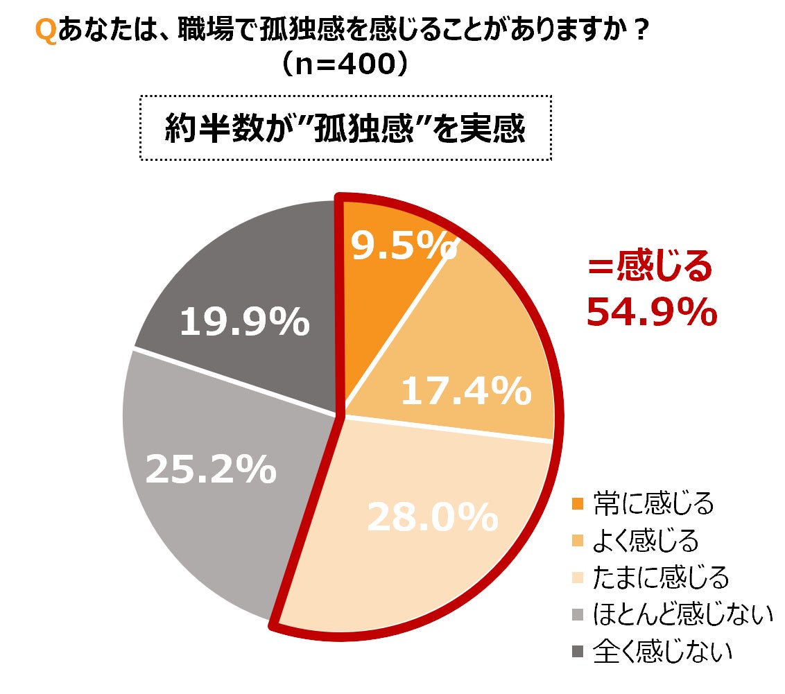 さらに、職場での孤独感について、「常に感じる(9.5%)」「よく感じる(17.4%)」「たまに感じる(28.0%)」と半数以上(54.9%)が職場で「孤独感を感じる」と回答しました。孤独感を感じる場面としては、「業務中(55.9%)」「ランチタイム(27.9%)」「休憩タイム(24.4%)」という結果になりました。