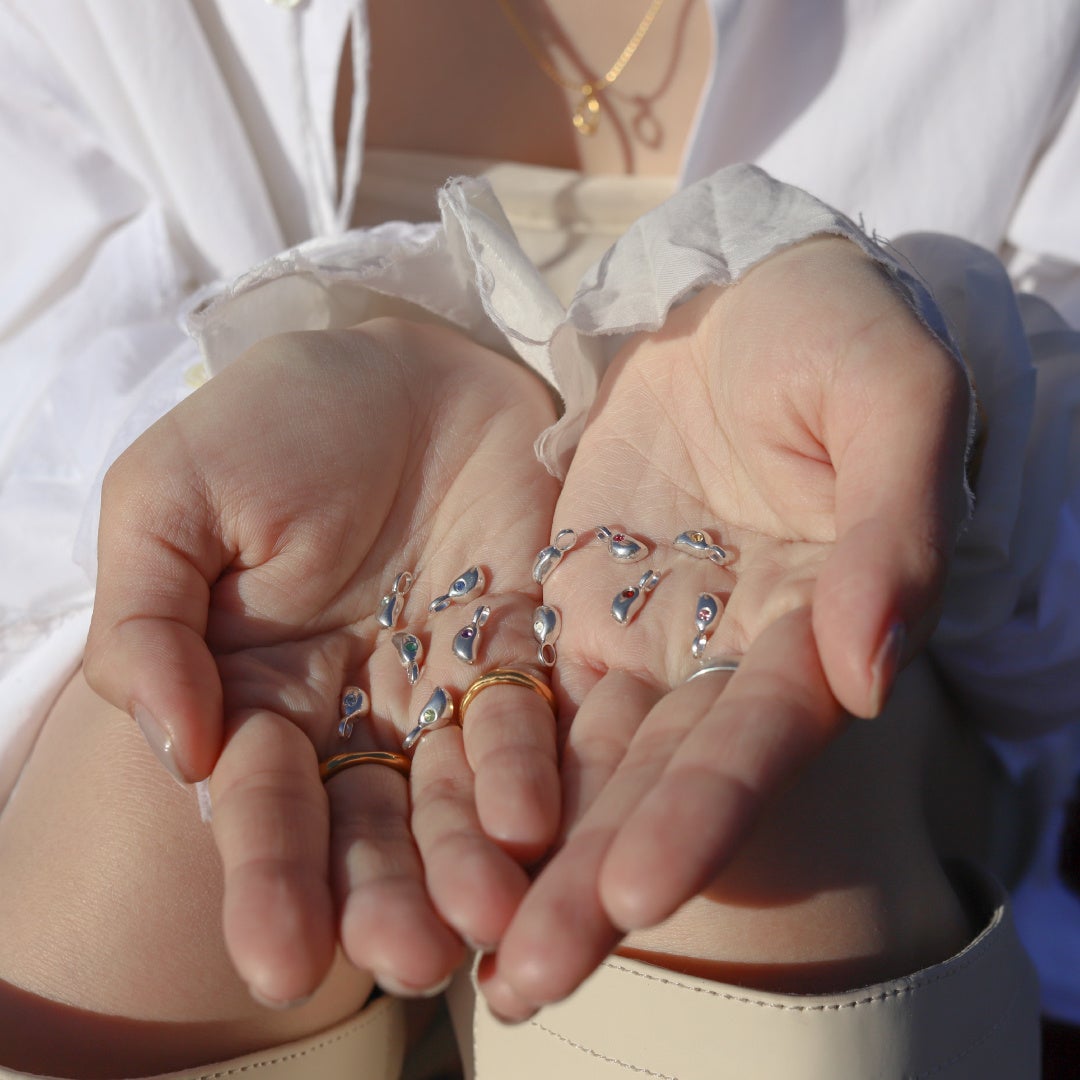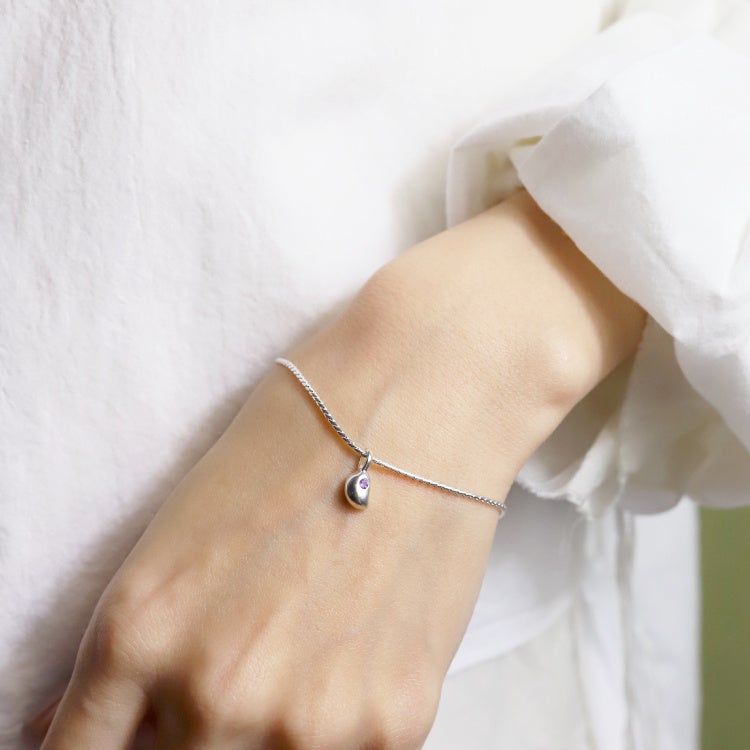 葉の上を泳ぐように揺れ落ちる雫をイメージして制作したチャームに、誕生石をあしらったデザインのスイムチャーム。