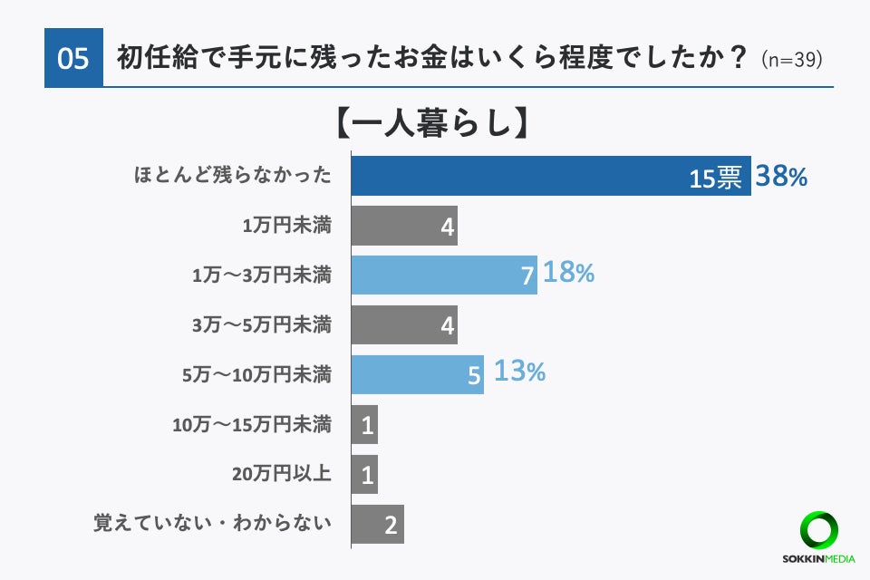 一方で、新卒当時一人暮らしだった方に絞ってみると、「ほとんど残らなかった」と回答した方が最も多く38%、次いで「1万〜3万円未満」18%、「5万〜10万円未満」13%という結果となりました。