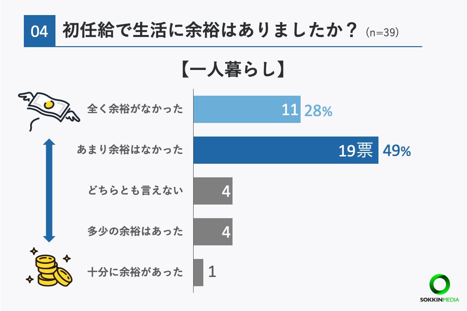 一方で、新卒当時一人暮らしだった方に絞って見ると、「あまり余裕はなかった」と回答した方が最も多く49%、次いで「全く余裕がなかった」と答えた方が28%という結果となりました。
