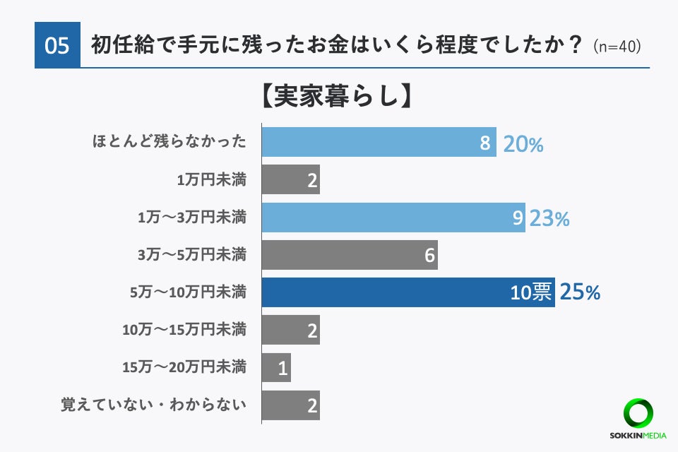 ・初任給で手元に残ったお金は実家暮らし「5万〜10万円未満」、一人暮らし「ほとんど残らなかった」
