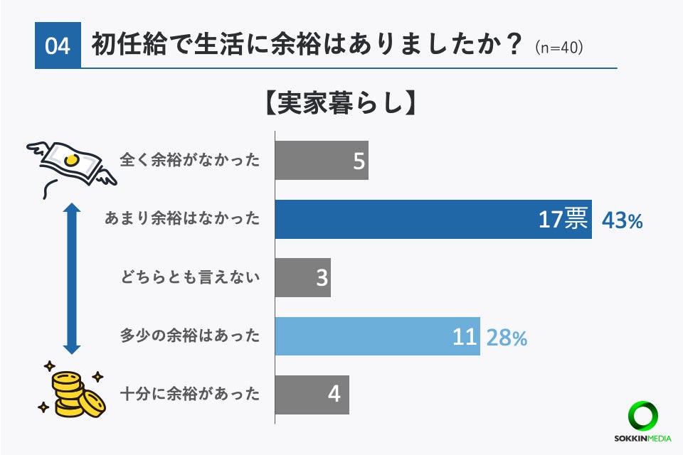 「Q4.初任給で生活に余裕はありましたか? 」という問いに対して、新卒当時実家暮らしだった方に絞って見ると、「あまり余裕はなかった」と回答した方が最も多く43%、次いで「多少の余裕はあった」と答えた方が28%という結果となりました。