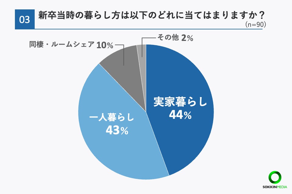 ・新卒時の暮らし方は「実家暮らし」「一人暮らし」がほぼ同割合