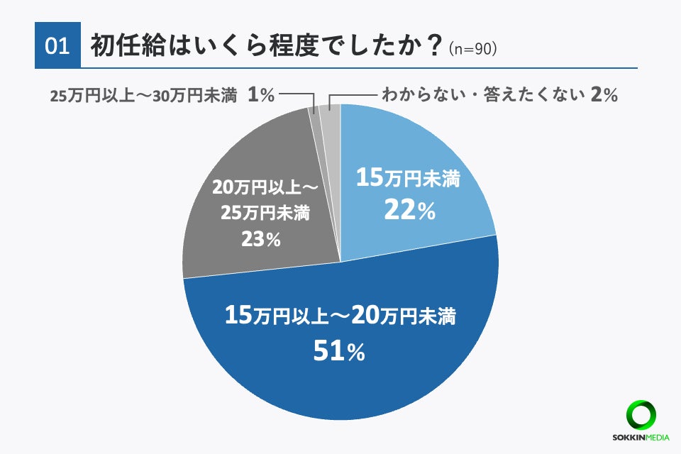 「Q1. 初任給はいくらでしたか?」という問いに対して、「15万円以上〜20万円未満」と回答した方が最も多く全体の51%を占めました。次いで、「20万円以上〜25万円未満」が23%、「15万円未満」が22%とほぼ同率となっています。