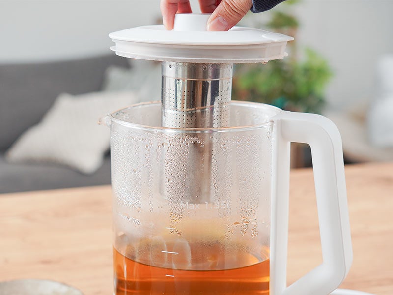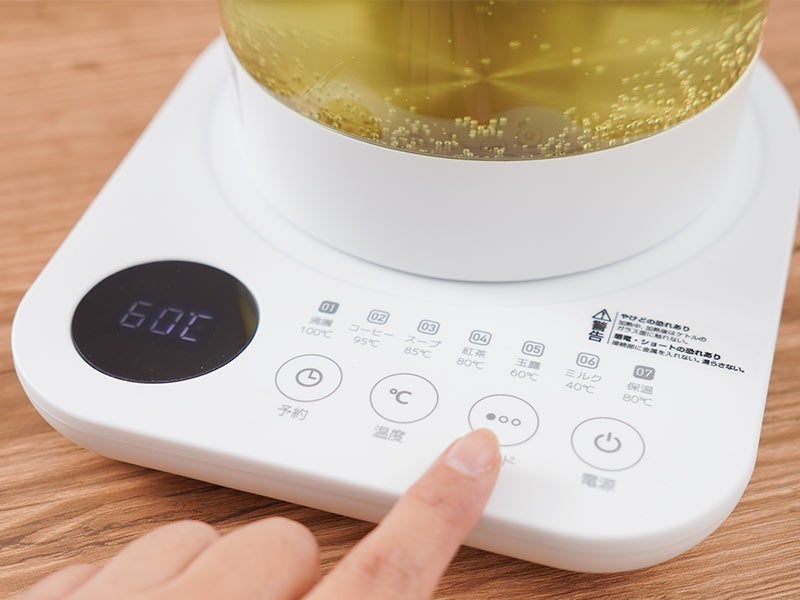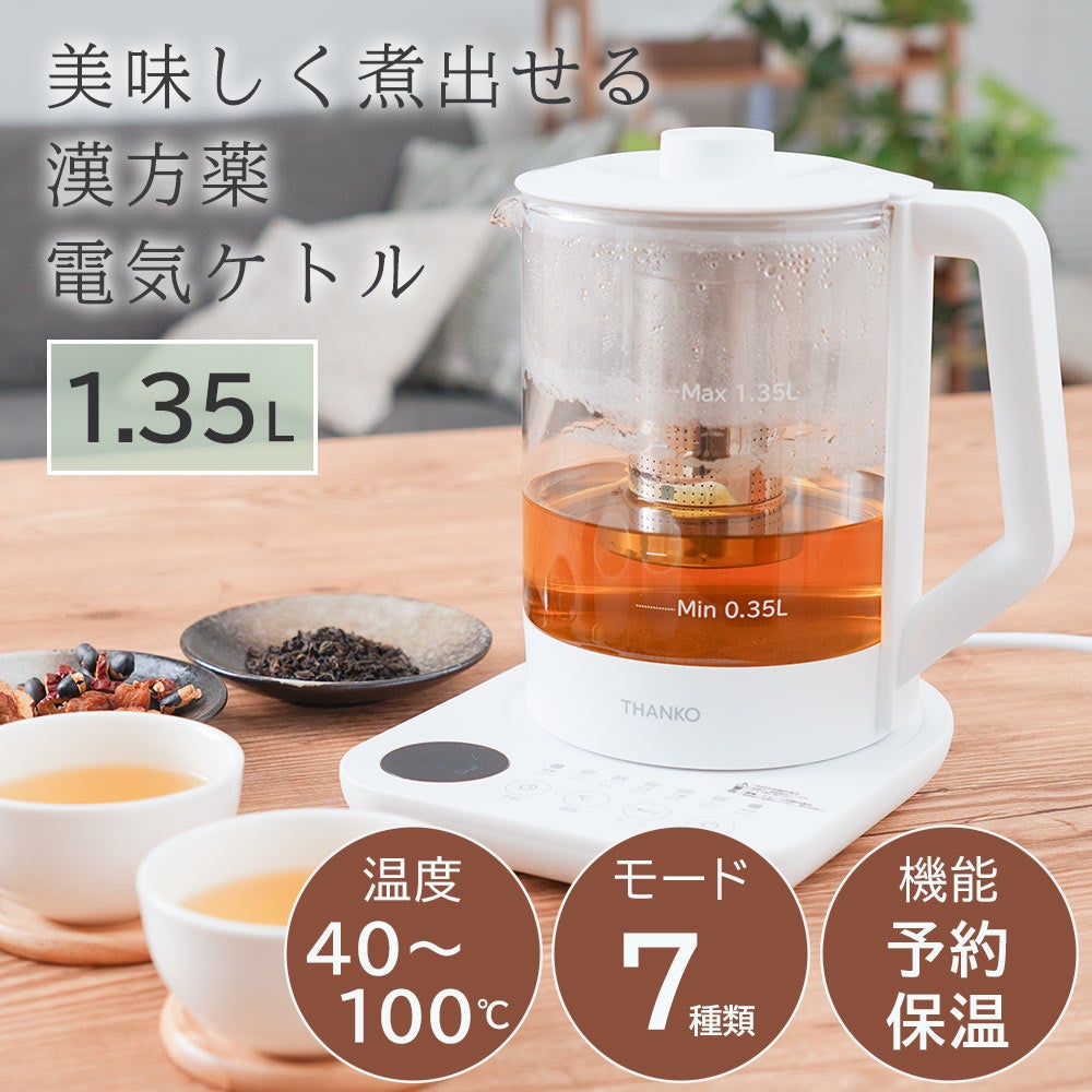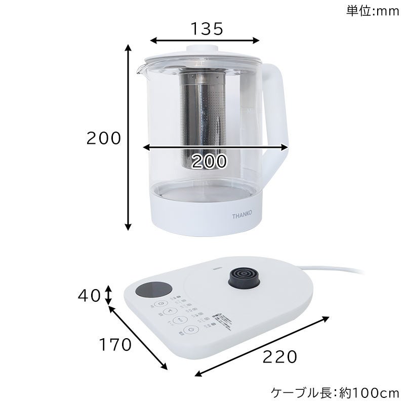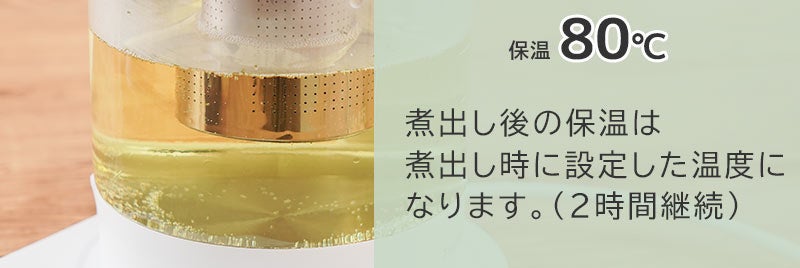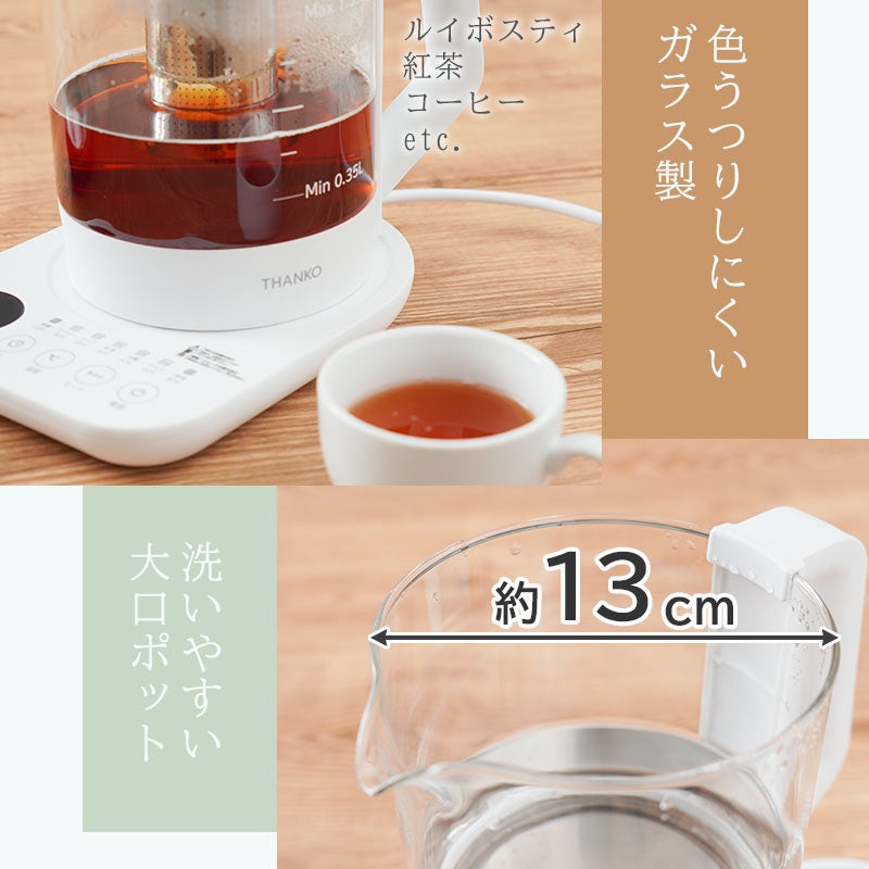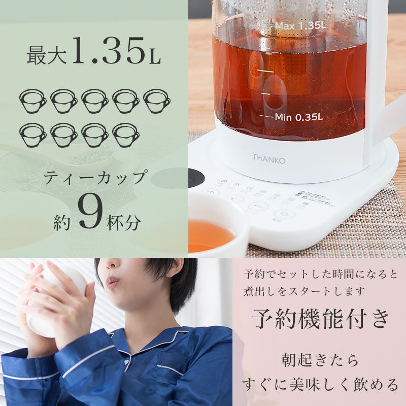 容量1.35L。本体に茶こしがセットできお好みの茶葉を入れてポット内で直接煮出すことが可能。ワンタッチで最適な温度で加熱する7種類のモードを搭載。沸騰100度、コーヒー95度、スープ85度、紅茶80度、玉露60度、ミルク40度、保温80度。加熱後自動で保温モードに切り替わり2時間保温し(沸騰モードを除く)煮出しが可能。モードを選択後お好きな温度にも設定可能(40~100度)。1-24時間後(1時間単位)に設定したモードで動作する予約機能を搭載。ガラス製なので湯量や中の色がすぐに分かります。