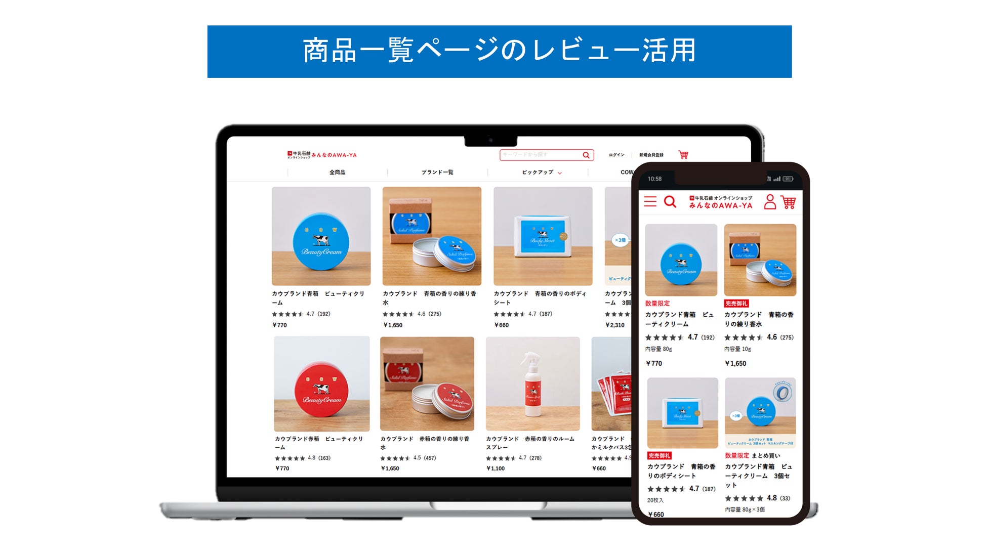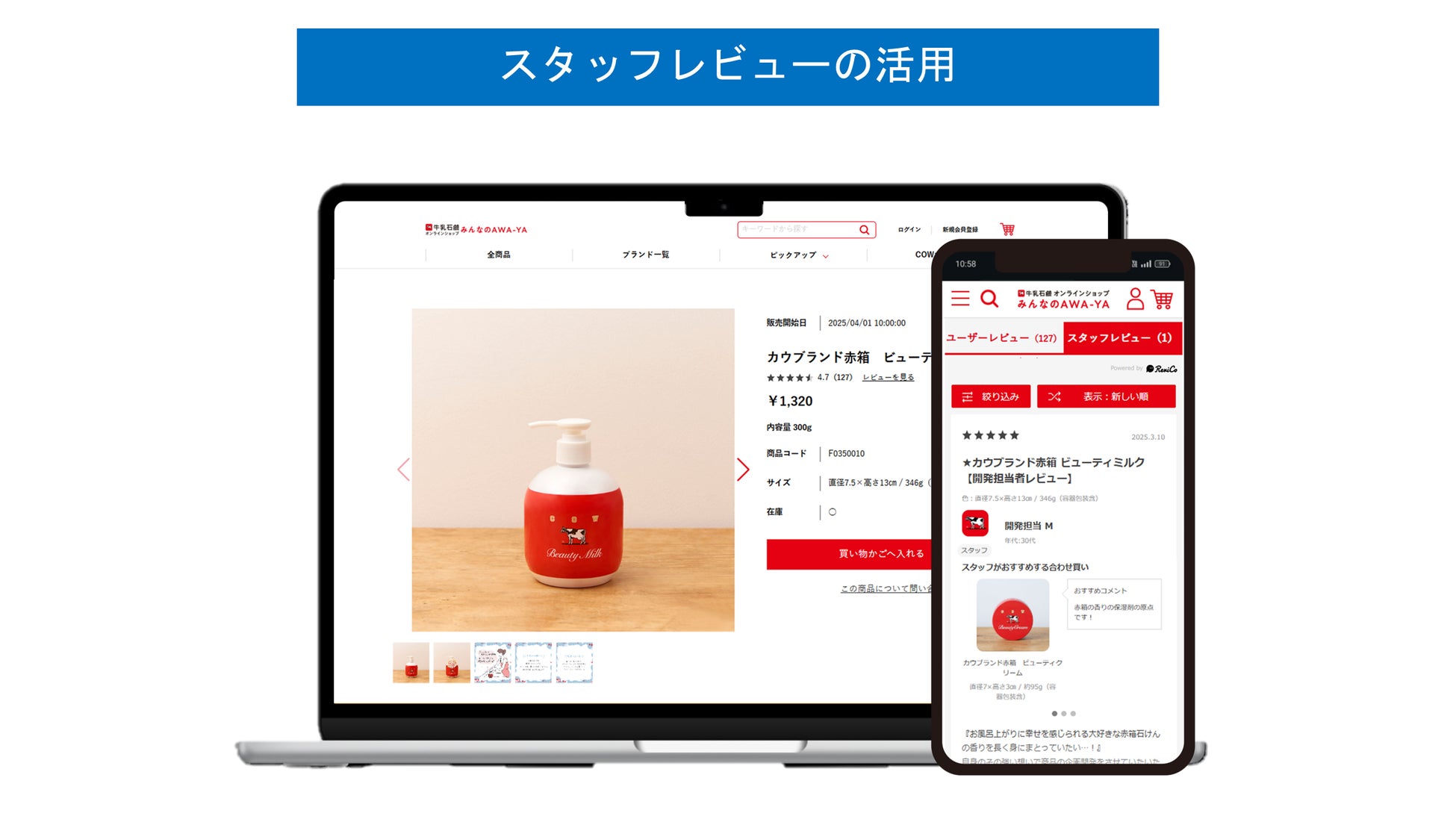 ReviCo導入以降、多くのお客様からレビューをいただき、毎朝その確認から一日が始まるのが習慣となりました。お客様の声は、他のお客様にとって参考になるだけでなく、私たちの改善や新たな取組みの大きなヒントにもなっています。牛乳石鹸オンラインショップ「みんなのAWA-YA」は、ファンの皆様のお声を原動力に、今後もライフスタイルに寄り添う活動を続けてまいります。
