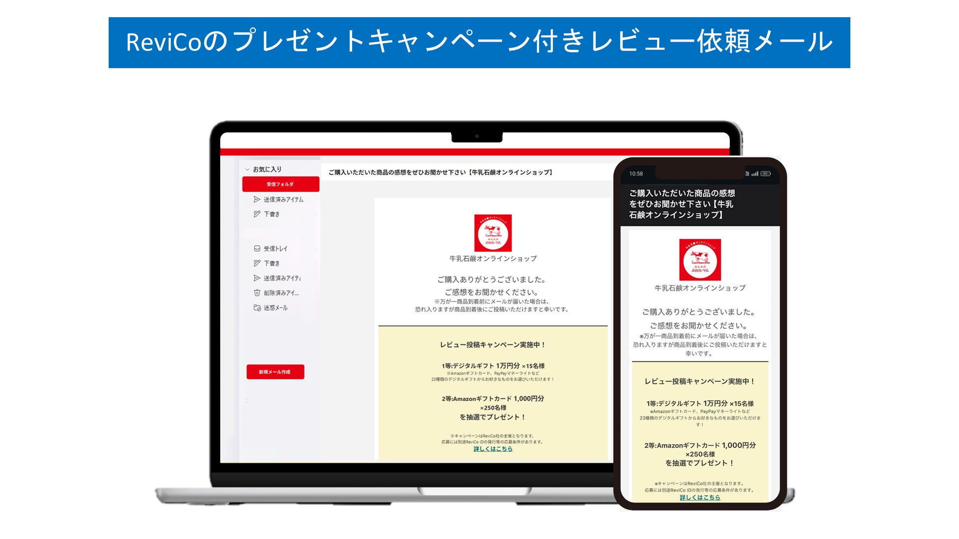 ReviCoが費用・抽選・発送を全て負担し実施するプレゼントキャンペーン付きレビュー依頼メールの配信や、最短1ステップで投稿が完了する簡易な投稿フローにより、継続的にレビューを獲得できます。