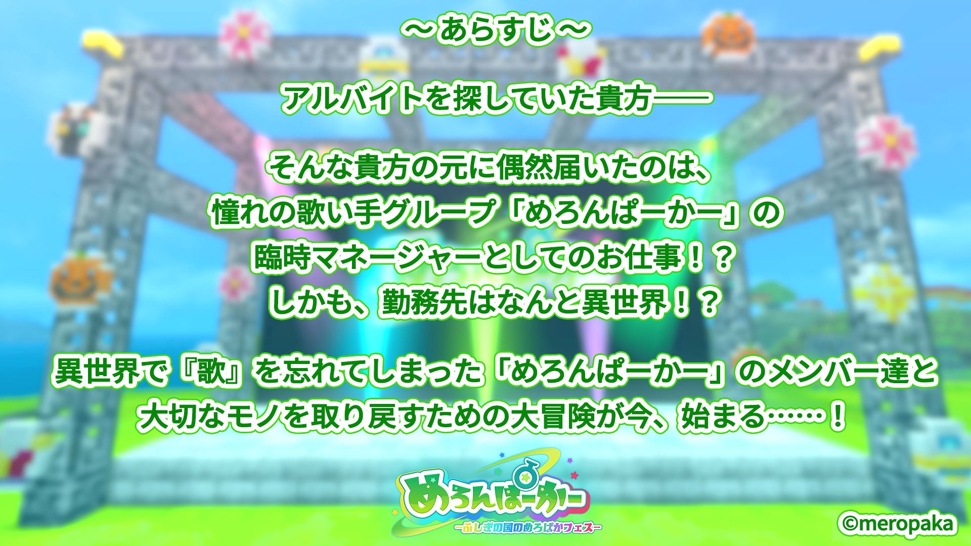 人気歌い手グループ『めろんぱーかー』のコラボワールド「めろんぱーかー ~ふしぎの国のめろぱかフェス♪~」が2024年5月30日(木)より登場します!