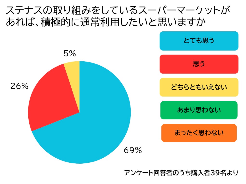 利用者アンケートでは、ステナス利用者の78%が「食品ロスへの関心が高まった」と回答し、「期限の短いものから購入するようになった」「買った商品を無駄にせず最後まで食べるようになった」「食べ残しが出ないように買う量を調整するようになった」等の具体的な行動変化が見られました。また、95%が「ステナス実施店舗を積極的に通常利用したい」と回答しており、店舗ロイヤルティ向上効果も示唆されました。