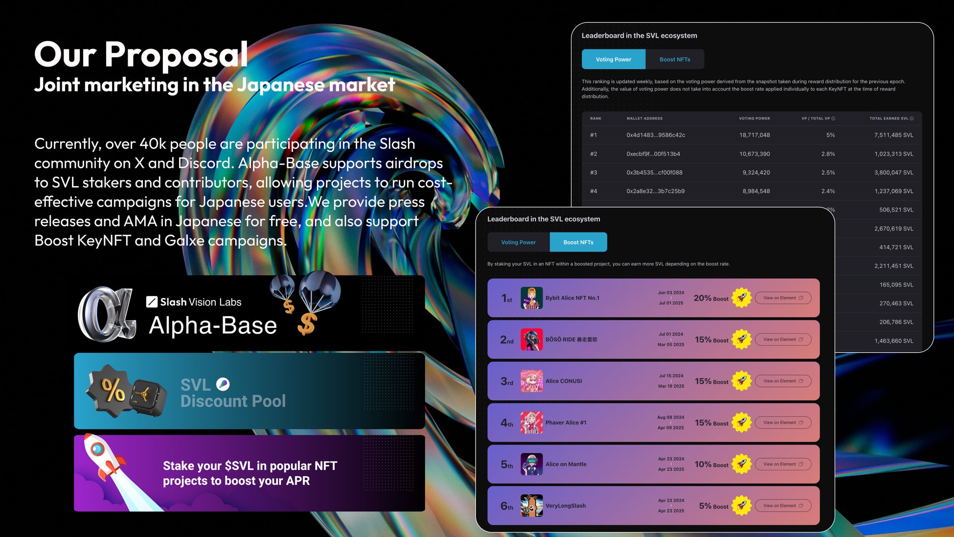 現在、SVLエコシステムにはXやDiscordを通じて、40000人以上のユーザーが参加しています。Alpha-Baseでは、SVLステーカーや貢献者へのエアドロップをサポートしており、各プロジェクトは日本市場のユーザーに対する費用対効果の高いマーケティング施策を実施できます。また、日本語でのプレスリリースやAMAを無料で提供しており、SVLステーキングのユーティリティを付与するBoost KeyNFTやGalxe OATキャンペーンにも対応しています。