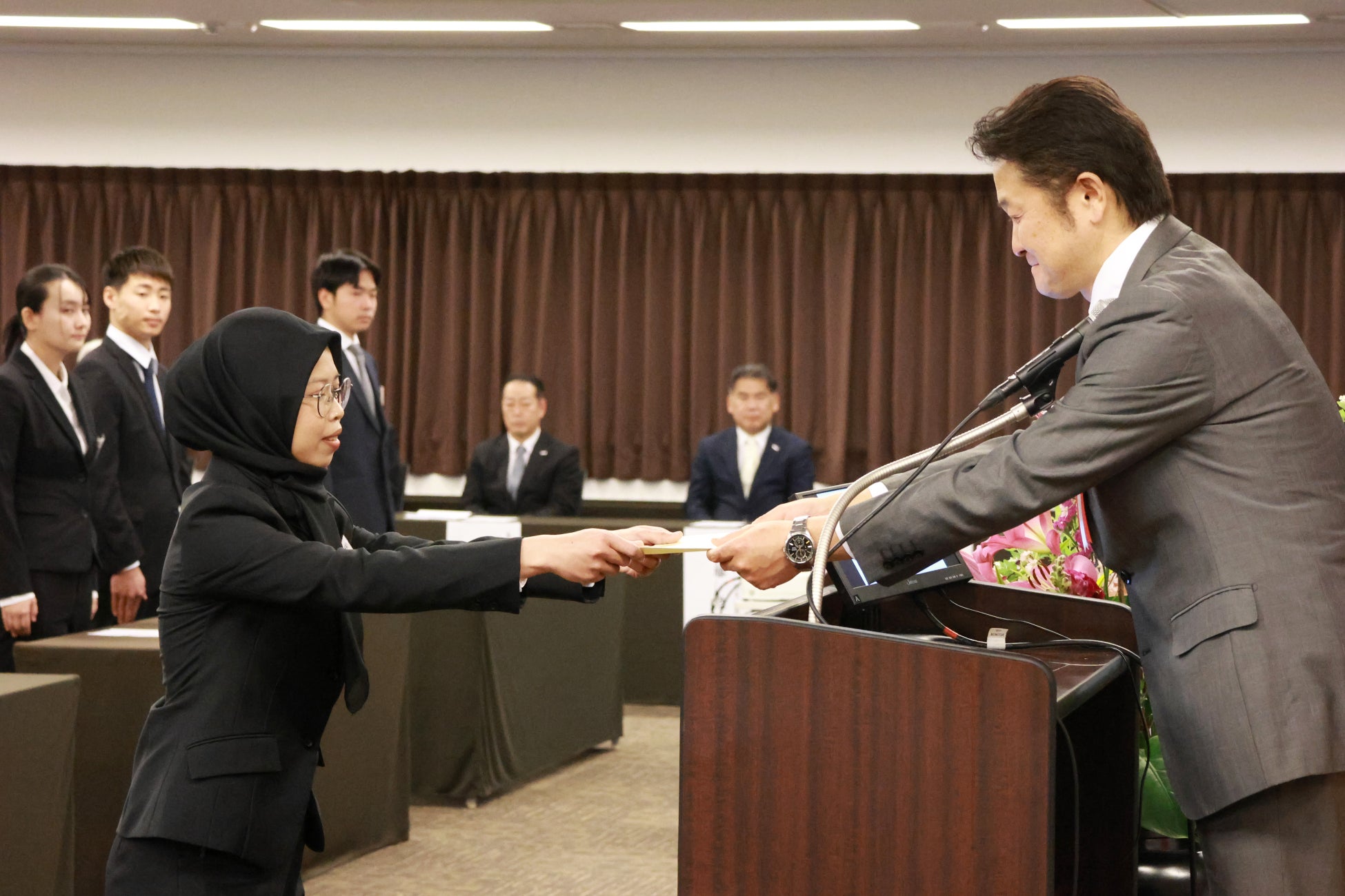 本年度の入社式は、全国14会場をオンラインで繋ぎ開催され、東洋ワークグループ株式会社代表取締役会長・須佐尚康による新入社員への祝辞、グループ各社の代表挨拶、新入社員への辞令交付、新入社員の決意表明、先輩社員から新入社員に向けての激励などが行われました。