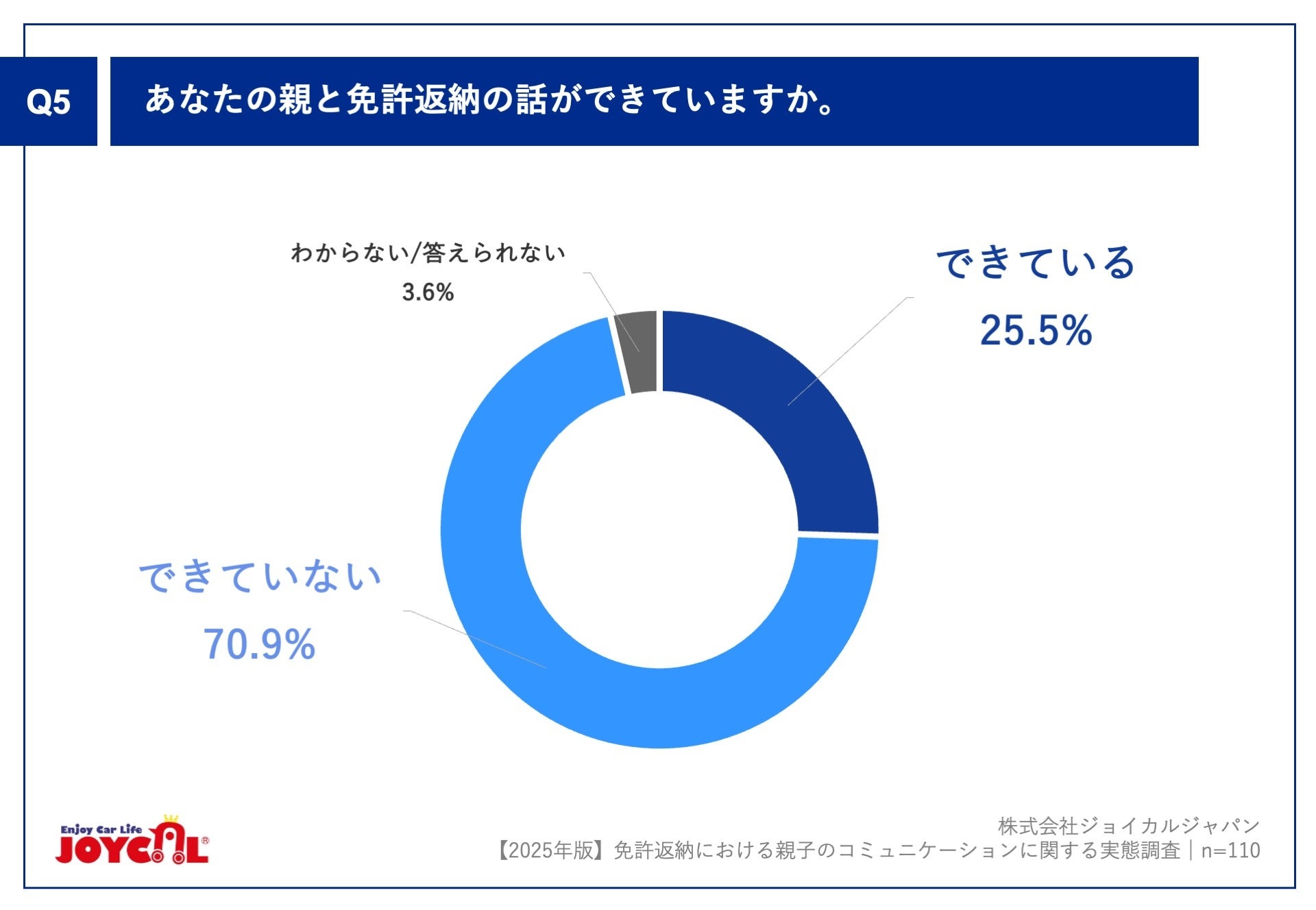 「Q5.あなたの親と免許返納の話ができていますか。」(n=110)と質問したところ、「できている」が25.5%、「できていない」が70.9%という回答となりました。