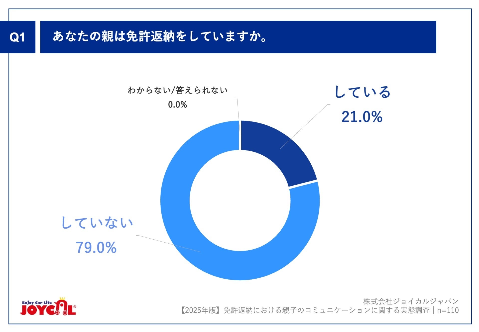 株式会社ジョイカルジャパン(本社:東京都千代田区/代表取締役社長 CEO 早川 由紀夫、以下:ジョイカルジャパン)は、70歳以上の地方在住(大都市圏(一都三県、大阪・愛知)を除く地域)で、車を運転する親を持つ方110名を対象に、【2025年版】免許返納における親子のコミュニケーションに関する実態調査を実施しましたので、お知らせいたします。