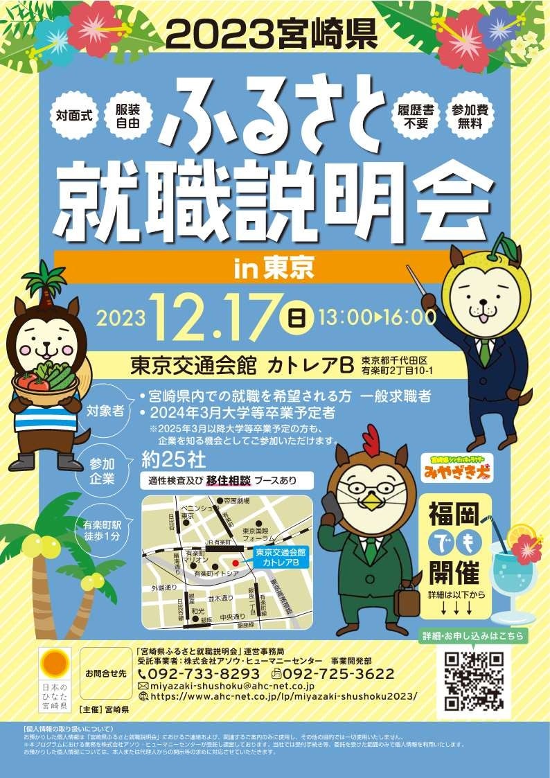 宮崎県では、UIJターン就職・転職を考えている一般の方や今後大学などを卒業する方を対象に、宮崎県内企業による合同企業説明会を福岡会場と東京会場で開催します。※要申し込み(当日申込も可能)
