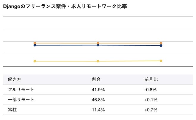 2025年8月時点のDjangoフリーランス案件・求人におけるリモートワーク比率は、フルリモートが41.9%、一部リモートが46.8%、常駐が11.4%です。フルリモートは前月比0.8%減、一部リモートは0.1%増、常駐は0.7%増です。