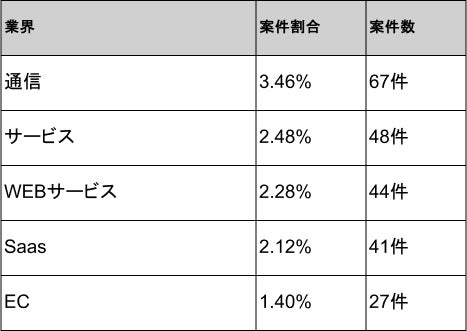 Django案件は通信業界が3.46%(67件)で最多、次いでサービスが2.48%(48件)、Webサービスが2.28%(44件)、SaaSが2.12%(41件)、ECが1.40%(27件)で、上位5業界の合計は約11.7%となり前月比微増です。