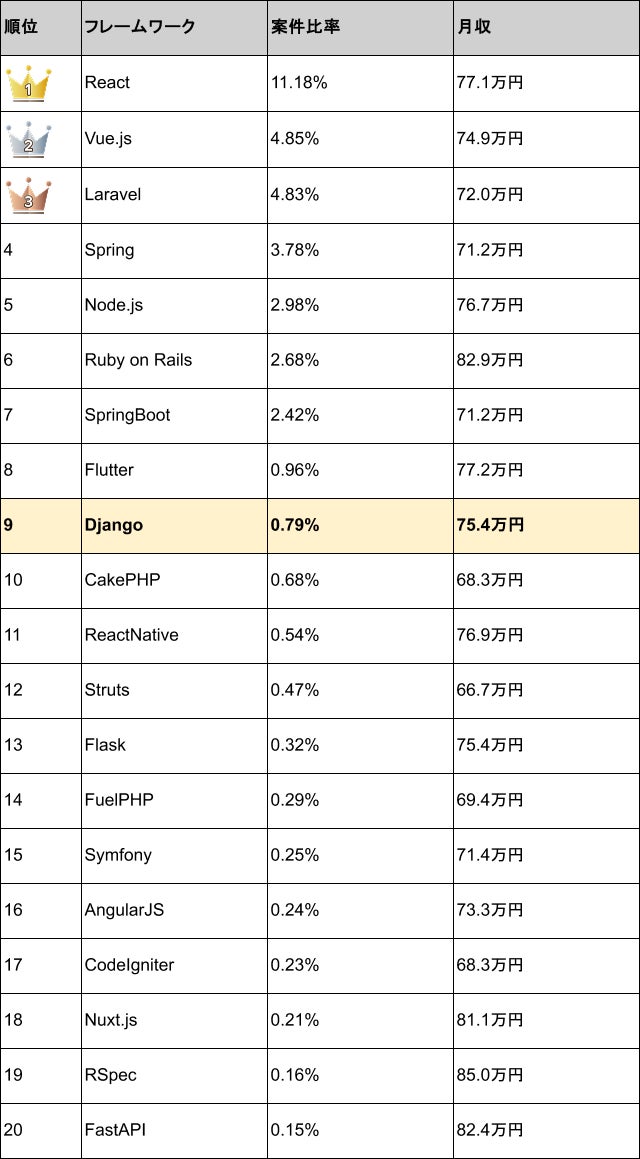 Djangoのスキルは、サーバーサイド開発において高い市場価値を持っています。その根拠として、フリーランス案件の平均年収は905万円(フレームワーク別12位)、案件数も全体の0.79%を占めてランキング9位と、報酬と需要の両面で安定したポジションを確立しています。