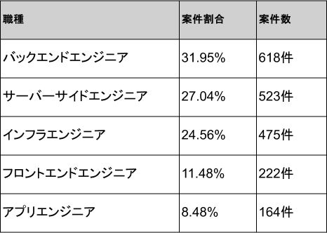 募集される職種はバックエンドやサーバーサイドエンジニアが中心ですが、インフラエンジニアの需要も高いのが特徴です。特に、Dockerなどを用いたコンテナ技術やCI/CDの知識を併せ持つエンジニアは、高単価案件を獲得しやすい傾向にあります。