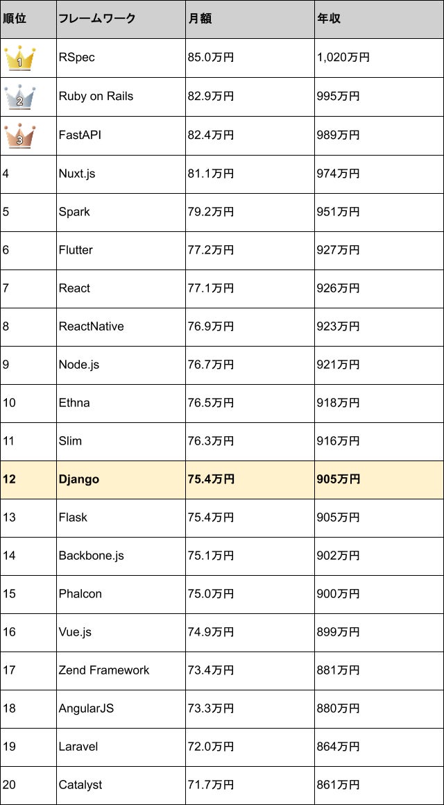 Django案件の平均月額単価は75.4万円、平均年収は905万円で、フレームワーク別年収ランキングでは12位に位置します。Djangoの最大の特徴は、開発に必要な機能が最初から豊富に含まれている「バッテリーインクルード」という思想です。