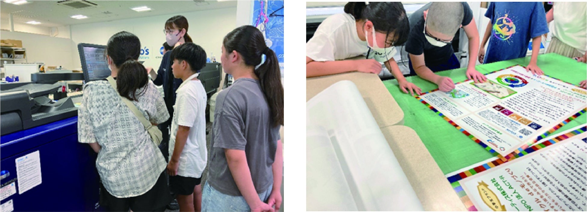 この度のイベント当日に着用するTシャツや展示するポスター、販売するノートは、平間小の児童がキンコーズ・川崎駅前店で、プリンターやカットマシンの操作方法を学びながら制作しました。完成した製品を手に、大きな感動と興奮の声が店内に響きました。