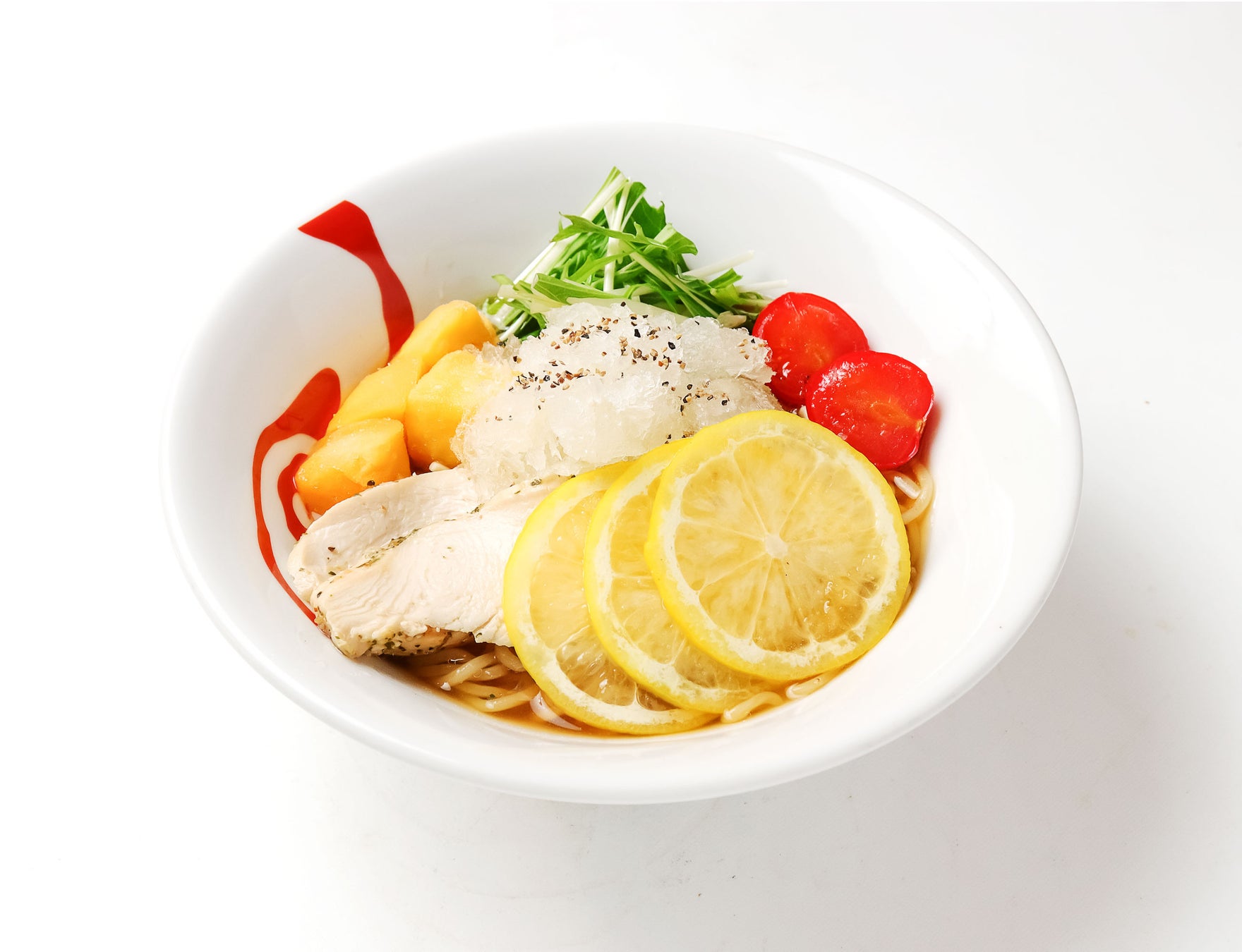 商品説明:醤油ベースの冷たいスープと、氷水でキッチリと冷した中太麺の上に、レモンシャーベット、冷凍レモンスライス、冷凍トマト、冷凍マンゴー、鶏ハムなどをトッピングしました。