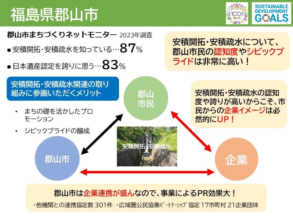 郡山市民の「安積開拓・安積疏水」の認知度やシビックプライドは非常に高く、また、郡山市役所は企業との連携事業が盛んなことから、参画いただく企業にとって「郡山市だからこそ」のビジネス展開が期待できます。