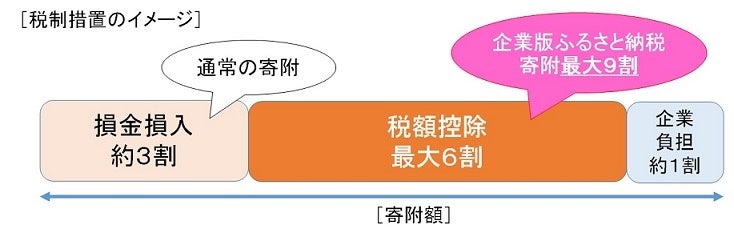 損金算入による軽減効果(寄附額の約3割)と合わせて、最大で寄附額の約9割が軽減され、実質的な企業の負担が約1割まで圧縮されます。