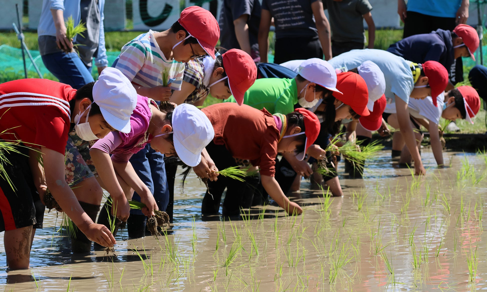 この日、同校近隣にある約3アールの学習田で田植え体験を実施。児童は、水の張られた田んぼに入り、近隣農家のアドバイスのもと、約2時間をかけて、キヌヒカリの苗を植えていきました。6年生が慣れた手つきで進めていくなか、1年生は初めて田植えを行う子もいて悪戦苦闘。学校の先生や上級生、地域の方々などに教えてもらいながら汗を流していました。