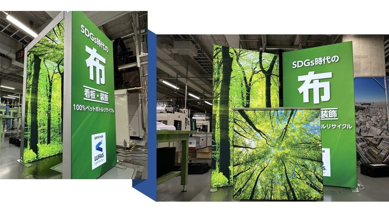 アクリル製看板に比べ製造時のCO2排出量を大幅に削減し、しかも布は100%ペットボトル再生で、万博の趣旨にピッタリ。