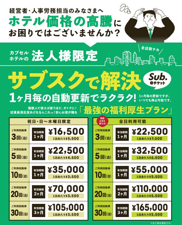 内容 :お風呂とサウナとよくばりなカプセルホテル安心お宿が「法人様限定のサブスクリプション」を販売開始いたします。