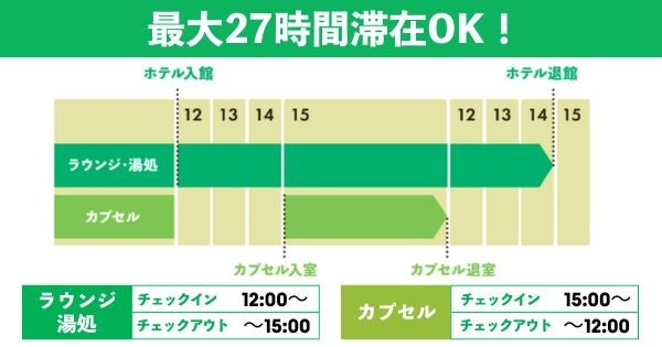 チェックインが早くて、チェックアウトが遅い(最大27時間)から、予定を組みやすい。宿泊は「お昼12時」から館内のサービス(湯処やラウンジ)を楽しめるため、チェックイン後の午後からの活動する時間も長く確保できます。また、チェックアウトも翌15時までなので、たくさんある無料サービスを全てお楽しみいただけますし、次への移動の時間調整にも最適です。