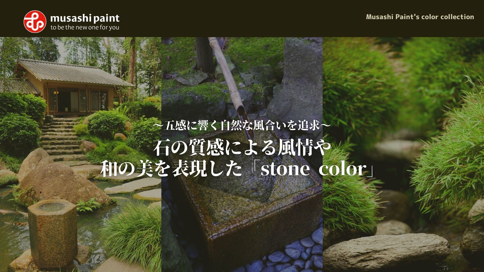 武蔵塗料は、人気の高い和テイストに着目し、日本の伝統的な庭園に配置されている石の質感と色合いを再現した塗料「stone color」を、武蔵塗料のカラーコレクションに加えました。