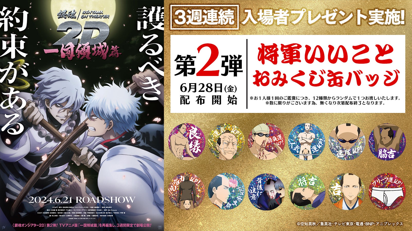 公開2週目となる6月28日(金)より配布される第2弾「将軍いいことおみくじ缶バッジ」は、本エピソードのキーマンである、江戸幕府の若き征夷大将軍・徳川茂茂を大々的にフィーチャーしたアイテム。これまで作中へ登場するたびに大きなインパクトを残し、様々な目にあってきた茂茂の歴代の勇姿や、象徴的な「もっさりブリーフ」など全12種をラインナップ。豪華絢爛なホログラム仕様に加え、シーンに合わせた一言おみくじも添えられるなど遊び心に溢れた、「銀魂オンシアター2D」上映だからこそ実現したスペシャルな缶バッジとなっている。