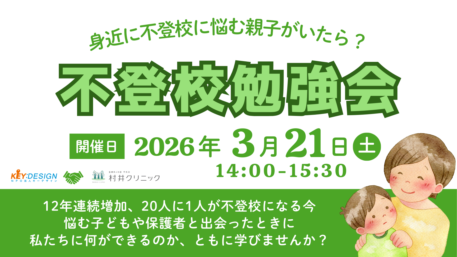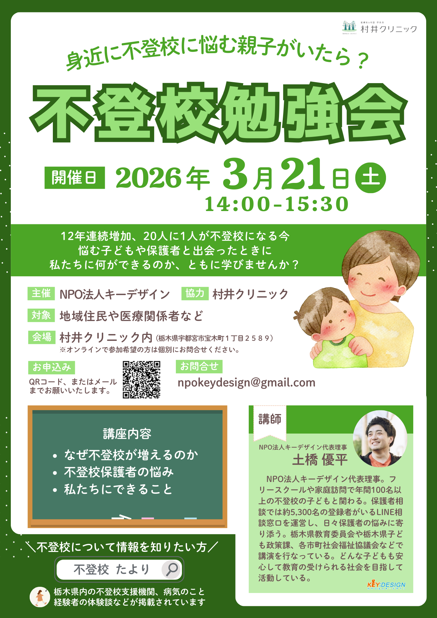 不登校の増加とともに深刻化する「不登校離職」。地域で支えるための第一歩として、宇都宮市内の村井クリニックにて、3月21日(土)に保護者・関係者向け勉強会を実施。