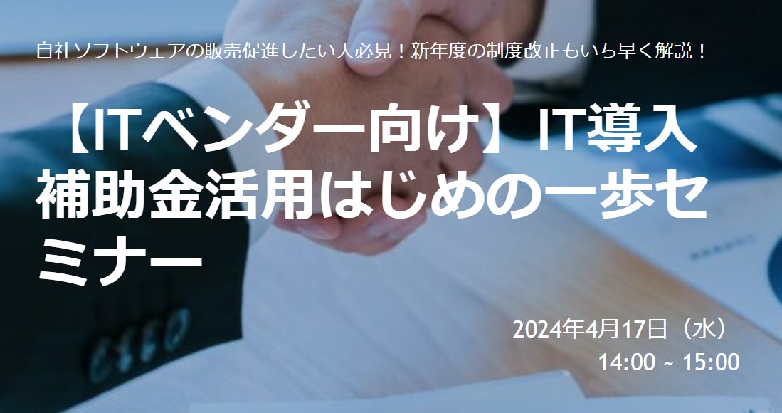 【4/17(水)開催】自社ソフトウェアの販売促進したい方必見!【ITベンダー向け】IT導入補助金活用はじめの一歩セミナーのお知らせ