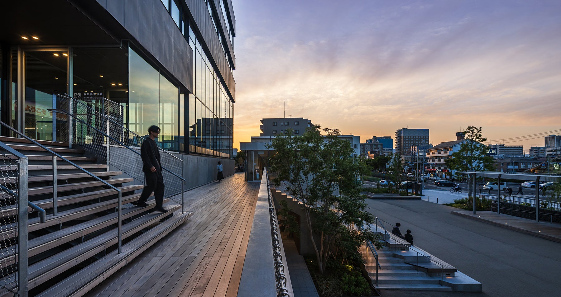 その目論見として、レストラン、ホールやこどものプレイルームといった、市民の集いの場となる小さな2つの棟を設け広場を囲んで位置づけることで存在を際立たせ、庁舎をその背面に配する分棟構成としました。分棟は、住宅地の広がるまちのスケールに馴染ませると共に、人を誘い込むヒューマンスケールな佇まいを生み出すことも意図しています。背後に配した庁舎は、水害対策と施設アクセシビリティの両立を図るため1階を駐車場とし2階以上に市役所機能を上げた計画としています。これを、大階段とテラスを介して緩やかに結ぶことで、広場と庁舎とに立体的な繋がりを生んでいます。市役所開庁後、毎月、市またはカフェ主催のひろばイベントが開催されており毎回多くの市民で賑わっています。ステージは市民の表現の場となり大階段やテラスは恰好の観覧席にもなっています。建築が建った後も、このような活動を活かせる器として多くの市民に活用されていることは、設計者として大変喜ばしいことです。今回の受賞は、市役所、ひと、まちがつながった、まちに開かれた市役所ということ等を評価頂きました。新しい市役所像づくりという目標に向けて共に取り組んで頂いた市の担当課の方々はじめ、関係者の皆様との協働により実現できたものと、感謝いたします。