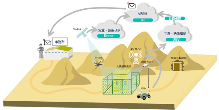 鉱山内の火薬類取扱所における火薬類の盗難及び火災防止対策として行われている見張人による監視業務について、固定カメラ、ドローン、UGV(無人地上車両)などのモビリティを活用して情報を収集し、AIによる画像解析技術、自動発報機能などのデジタル技術による代替が可能か検証しました。この検証では、低軌道衛星の活用や、高精度位置特定システムの採用、エッジコンピューティングシステムとAIによる解析、モビリティのプラットフォームとAIプラットフォームの連携など高度な技術を用い、デジタルによる代替の実効性を確認しました。