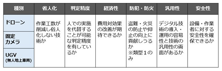 プラント保安設備等の固定バルブの開閉、モータ等の作動状況、配管の劣化、計器の指示値読取り等の定期点検を、デジタル技術を活用することによりアナログ規制の見直しが可能か技術検証しました。この検証では、ドローンポートによって効率的で安全なドローン運用を実現するシステムを活用するなど、複数の実施項目を通じて、多角的な評価の観点を設定し、デジタル技術による代替が可能か検証しました。