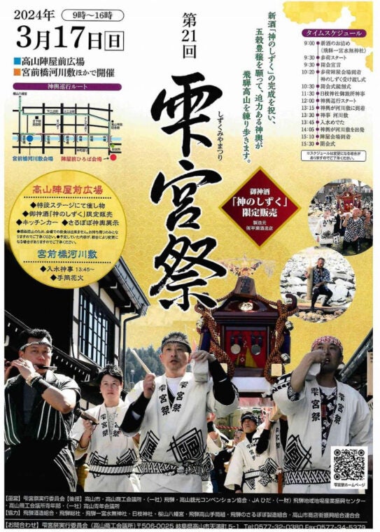 新酒完成の祝いと五穀豊穣を願って、飛騨の若者が酒樽神輿(さかだるみこし)を担いで飛騨高山の街を練り歩くお祭り「第21回雫宮祭(しずくみやまつり)」が、令和6年3月17日(日)に開催されます。