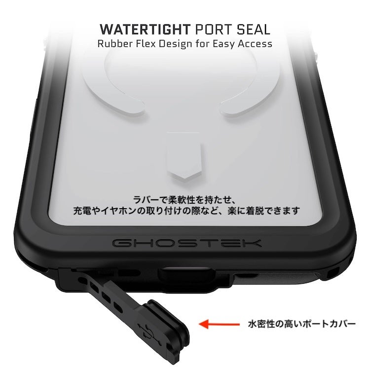 着脱はとても簡単。タッパーの蓋を閉めるのと同じように、リアパネルをケース本体に360度はめ込むだけ。またケース底部には水の侵入を防ぐ簡単に着脱できるポートを備え、その両脇のマイク/スピーカーや気圧調整口には空気は通すが水は通さない防水シールを採用し、出来る限りマイクに配慮した設計になっています。